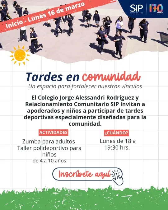 Con el objetivo de fortalecer los lazos entre las familias y la comunidad escolar, el Área de Relacionamiento Comunitario de SIP Red de Colegios invita a participar en “Tardes en comunidad: un espacio para fortalecer nuestros vínculos”, una actividad especialmente pensada para las familias de nuestro colegio.